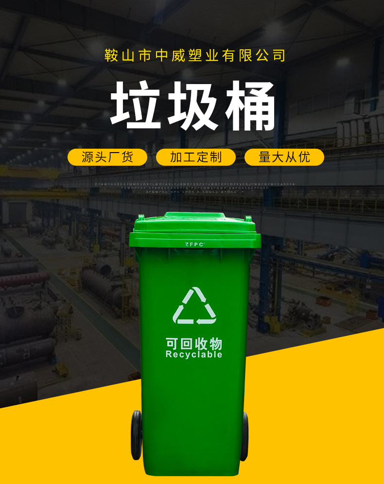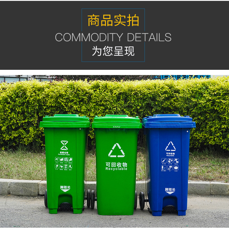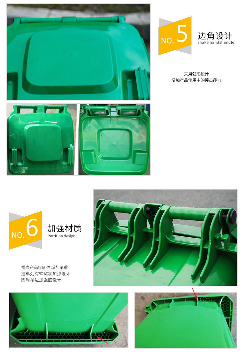 9)240L塑料垃圾桶均采用100% 高密度聚乙稀(HDPE)全新料制造,產(chǎn)品材質(zhì)注入了高質(zhì)量的占整個(gè)材質(zhì)2%以上的防曬紫外線原料和占整個(gè)材質(zhì)3%以上的顏料色素,垃圾桶具備防紫外線防老化功能,桶顏色3年保持光澤、鮮艷不褪色;輪胎采用優(yōu)質(zhì)的天然橡膠材質(zhì),輪軸采用45#中碳鋼。
